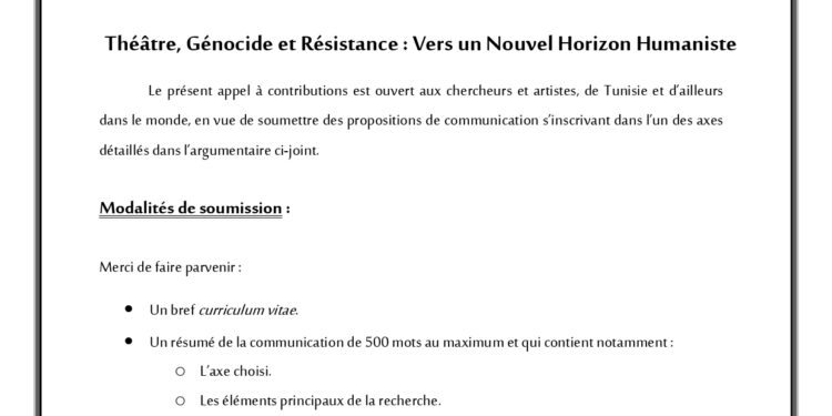 Appel à contributions au Colloque Scientifique International de la 25ème édition des Journées Théâtrales de Carthage Le Comité directeur de la 25ème édition du Festival International des Journées Théâtrales de Carthage, qui se tiendra à Tunis du 23 au 30 Novembre 2024, organise un colloque international, du 25 au 27 Novembre 2024, autour du thème : Théâtre, Génocide...